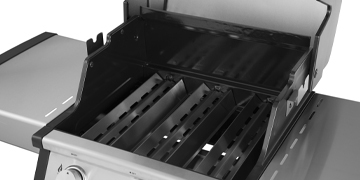 The flame tamers are designed to distribute heat evenly and prevent flare-ups. It is perfect for you to slow-roast chickens with a rotisserie spit on integrated racks.