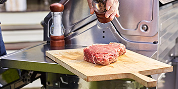 Sturdy side table accommodates a raft of grilling accessories and seasonings within arms’ reach.